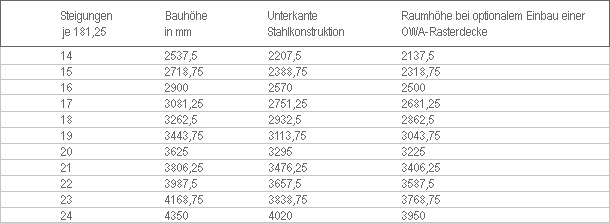 Unsere Bauhöhen sind ein Vielfaches unserer Treppensteigung von 181,25mm. Die Stützenprofile sind entweder 180x180mm oder rund mit d=180mm. Bei einem Deckenaufbau von 30mm Multiplex und 300mm Hauptträger ergeben sich folgende Bauhöhen: